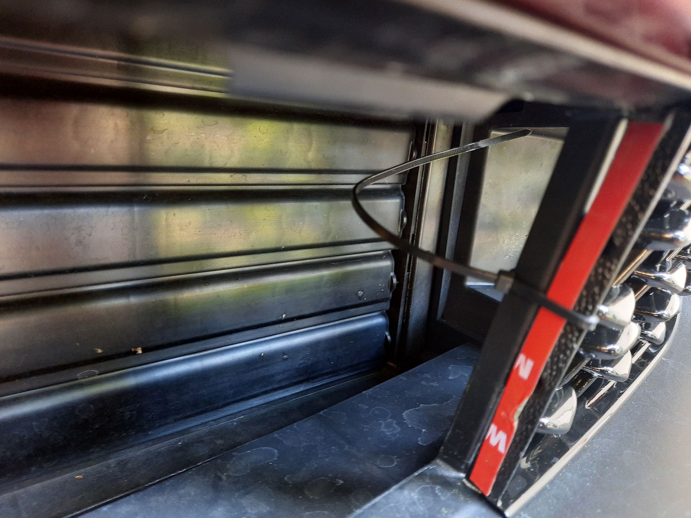 6. Die 2 Gitter ankleben und mit Kabelbinder zusätzlich sichern. Muss nicht sein, aber denen trau ich mehr als den gefälschten 3M-Klebestreifen der Chinesen. Da wo man die rote Folie auf dem Klebeband sieht sollte das normaler an den Halter angeklebt werden. Also ohne diese ganzen Basteleien hier.